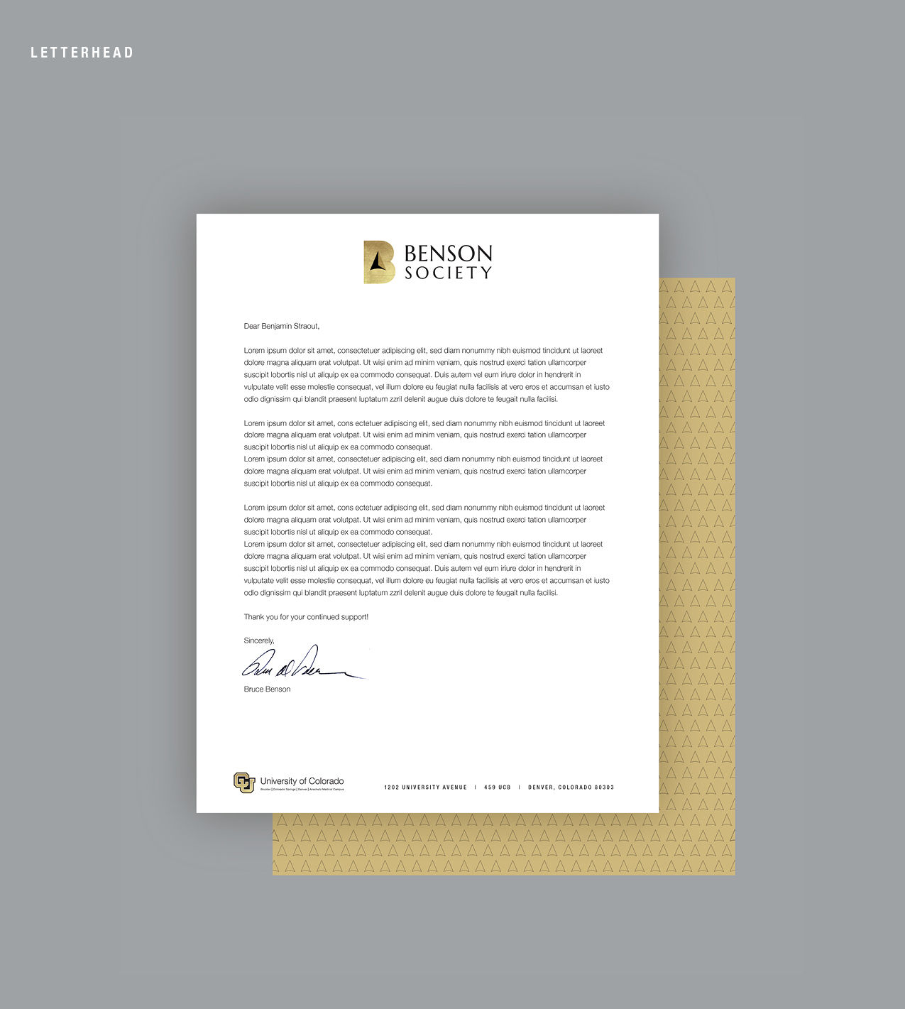The Benson Society honors CU's visionary donors, celebrating the philanthropic legacy of Bruce and Marcy Benson to inspire transformative investments for CU. As Art Director, I conceived and executed an elegant, timeless, bold brand identity for fundraising collateral, donor reports, presentations, galas, and events. This distinct brand complements CU system branding yet powerfully stands out. I also coordinated with vendors on custom donor packets, collateral, ensuring seamless production. The new identity successfully launched, a sophisticated, compelling visual system that elevated donor engagement, fundraising efforts.