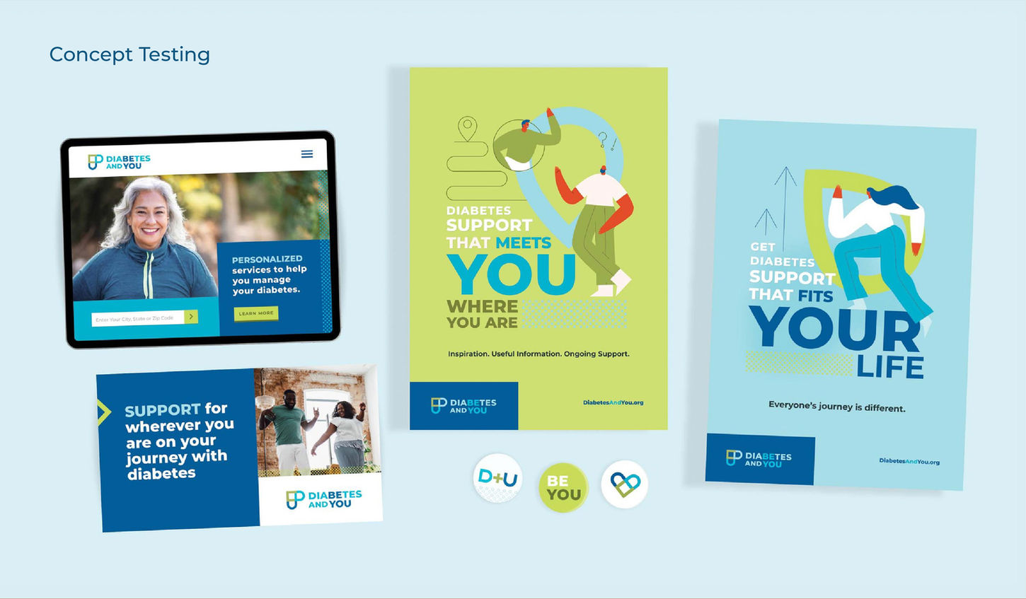 The Diabetes and You rebrand aimed to boost underutilized Diabetes Self-Management Education and Support (DSMES) services with a cohesive, people-centered brand. I teamed with our Art Director and research team to develop design concepts for focus groups. Based on these insights, I assembled a vibrant visual identity, applying it across templates, promotional tools, and custom photography. I also consulted on art direction for the photoshoot, working with photographer to ensure authentic, empowering visuals. The CDC received a fully developed, research-informed campaign identity and materials for clearer, more effective DSMES promotion.