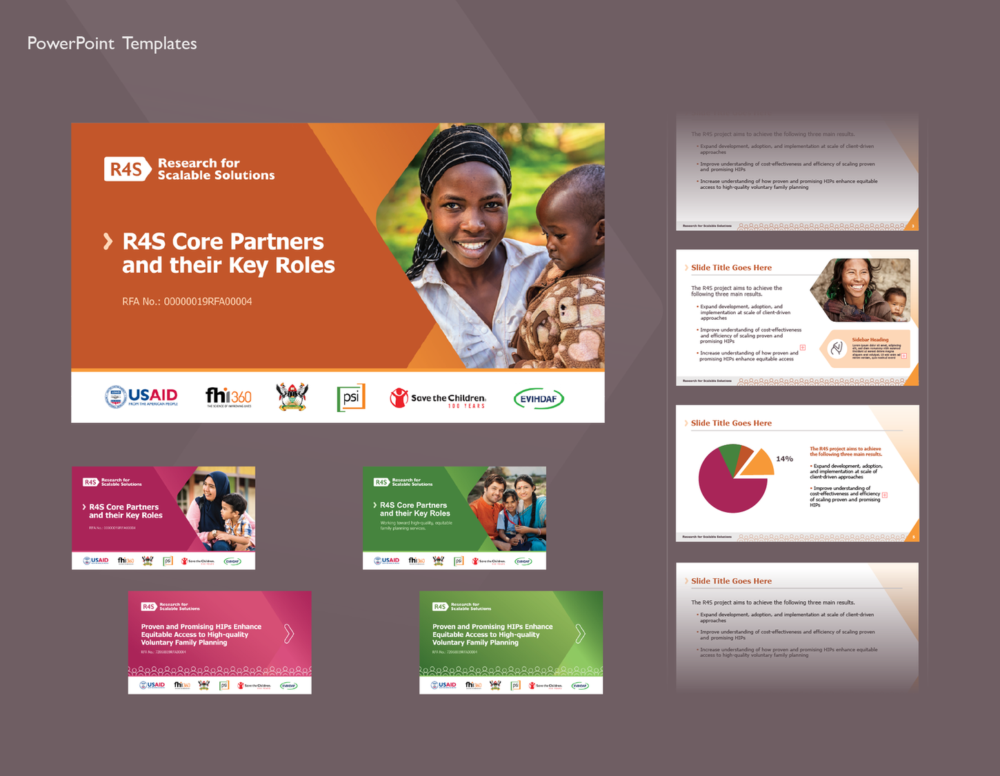 developed a brand identity for the Research for Scalable Solutions (R4S) project, a USAID-funded initiative that conducts implementation science research to improve the efficiency and equity of family planning programs in Africa and Asia. The goal was to create a distinct, people-centered visual system that felt both credible and approachable, resonating with key audiences in these regions. From three initial concepts, I delivered a clean, flexible design system selected for its clarity and adaptability. The brand incorporates USAID’s Gill Sans typography, complemented by a warm, trustworthy color palette. A simple arrow mark symbolizes forward progress, while a custom family pattern reflects the project’s focus on family planning and community well-being. These elements, along with a consistent icon style, were applied across all R4S materials—from reports to presentations—supporting a strong and unified program launch.